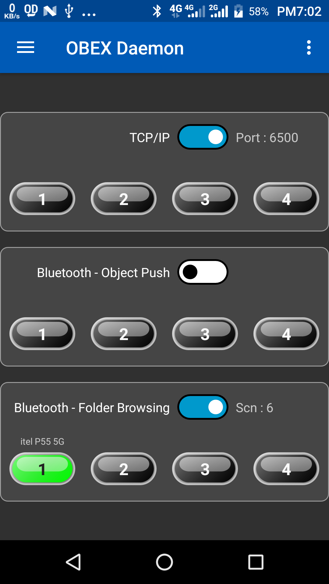 OBEX Daemon for Android supports following transports:- TCP/IP (Wi-Fi / hotspot, ethernet, bluetooth tethering, USB tethering)