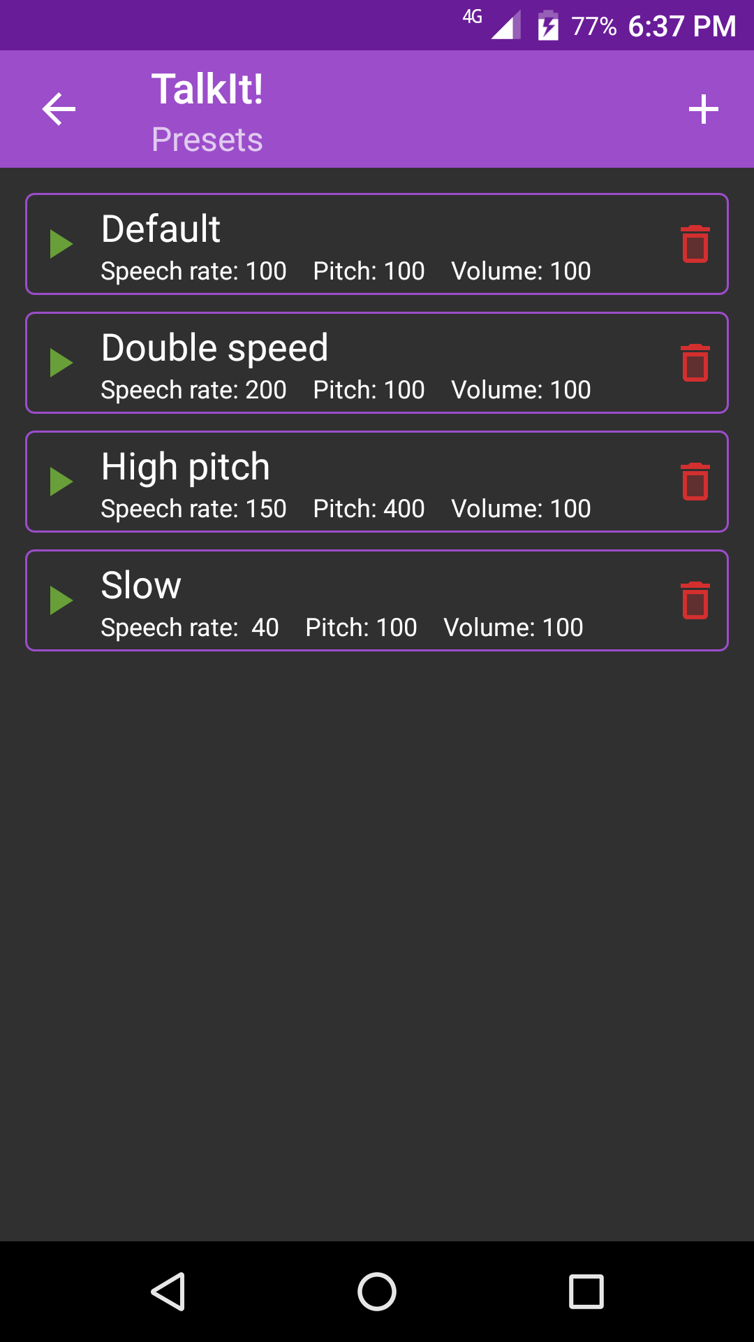 - Customizable preset (speech rate, pitch, and volume)